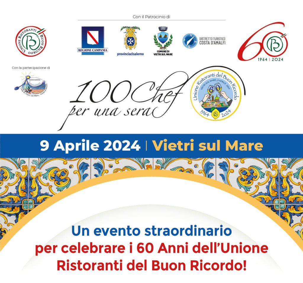 Conto alla rovescia per “100 Chef per una sera”, la cena – evento che l’Unione Ristoranti del Buon Ricordo organizza il 9 aprile a Vietri sul Mare per festeggiare il suo 60° compleanno. Firmata da 100 Chef dell’associazione, solo su prenotazione (fino ad esaurimento posti), accompagnata in tutte le portate dal perlage di pregiati Franciacorta, la cena sarà riservata ad un massimo di 1.000 persone. Di grande suggestione la location, lo scenografico Lungomare della Rosa dei Venti dell’incantevole località della Costiera Amalfitana, dove ha sede anche la storica Ceramica Solimene, che fin dal 1964 produce i famosi piatti del Buon Ricordo che raffigurano la pietanza simbolo di ciascun locale e vengono donati come “Buon Ricordo”, appunto, di un’indimenticabile esperienza culinaria. Come da tradizione, i commensali riceveranno, in ricordo di una serata che si preannuncia memorabile, il piatto del 60° dipinto a mano dagli artigiani di Solimene, realizzato in edizione speciale datata e numerata e in distribuzione solo in occasione dell’evento, a sottolinearne la storicità e l’unicità. La cena avrà una finalità assolutamente benefica, dato che il ricavato (tolte le spese vive) sarà devoluto a due associazioni del territorio (L’Abbraccio OdV e OPEN – Oncologia Pediatrica e Neuroblastoma Onlus) e gli Chef e i ristoratori presteranno la loro opera gratuitamente.