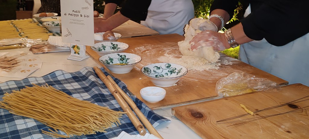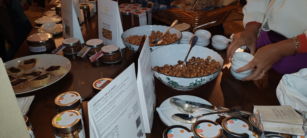 Il viaggio nel cuore della Dieta Mediterranea, ha toccato infatti i vertici del gusto con la presenza delle alici di menaica e della colatura di alici di Cetara, dei celebri fichi del Cilento, dei prodotti skincare realizzati con latte di bufala, dei fusilli fatti a mano di Felitto e di Gioi fino alla mozzarella e ai formaggi di bufala. Dall’olio extravergine di Felitto, ai vini e all’olio di Ottati, dai fagioli, dall’orzo e dalle spezie di Controne ai salumi e alla soppressata di Gioi Cilento, dai vini Mastroberardino, eccellenza campana, alle tisane di Gioi, dalle conserve e dai carciofini della piana del Sele, alla nocciola tonda di Giffoni e all’olio aromatizzato allo sfusato amalfitano di Tramonti, fino alla pasta realizzata con farina di castagne e ai pomodorini rosa di Rofrano. I produttori hanno esposto con orgoglio le loro prelibatezze, illustrando ai partecipanti i processi artigianali dietro ogni prodotto. Le degustazioni hanno permesso di apprezzare non solo la qualità, ma anche la storia e la passione che hanno accompagnato ogni sapore. L’evento ha anche visto la partecipazione dell’executive chef Armando Aristarco che ha proposto una serie di piatti emblematici della Dieta Mediterranea, combinando sapientemente ingredienti freschi e di stagione con i prodotti presenti durante la serata. Il menù ha celebrato la semplicità e l’equilibrio della cucina mediterranea, che è un modello di salute e benessere. Cavatelli alla farina di castagne con patate, prezzemolo e colatura, fusilli di Felitto al pomodoro e basilico, orzotto al limone, colatura e vongole, totani e patate, paste in miniatura della tradizione partenopea come le soffici graffe di patate con crema spalmabile bianca alla nocciola di Giffoni.