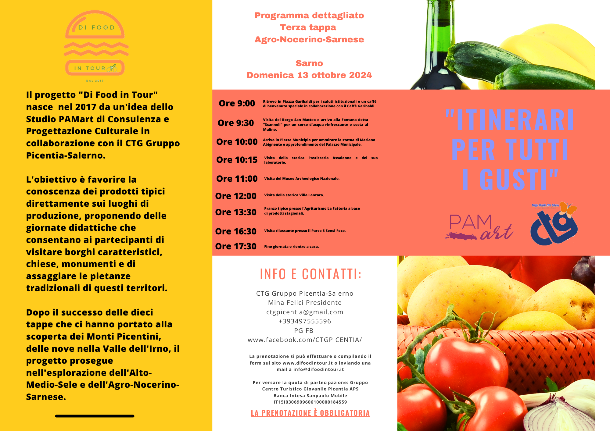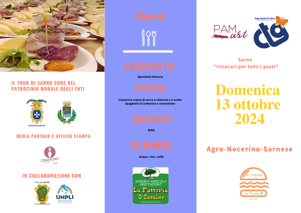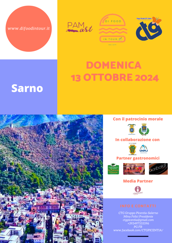Domenica 13 ottobre 2024 alle ore 9:00, Di Food in Tour giunto alla terza tappa nel territorio dell’Agro-Nocerino-Sarnese (prenotabile sino a venerdì 14 giugno tramite questo link: 13.10.2024 Sarno – Di Food in Tour – Itinerari per tutti i gusti ) si avvarrà anche questa volta del patrocinio morale della Provincia di Salerno e del Comune di Sarno, con il supporto logistico della Pro Loco Città di Sarno. i partecipanti inizieranno la visita della storica cittadina di Sarno, dopo i saluti dell’Amministrazione comunale rappresentata dal Sindaco Francesco Squillante e della Pro Loco, e un caffè di benvenuto in collaborazione con il Caffè Garibaldi. Partendo da Piazza Garibaldi ci si dirigerà verso il Borgo San Matteo, sino ad arrivare alla Fontana detta dei 3cannoli per una sosta rinfrescante. A seguire sosta presso il Mulino, gioiello di archeologia industriale, situato in Via dei Liguori. Il programma proseguirà in Piazza Municipio per ammirare e conoscere la storia del Palazzo Municipale e del monumento dedicato a Mariano Abignente, uno dei partecipanti alla disfida di Barletta del 1503. Dopo ci sarà modo di poter visitare la rinomata Pasticceria Assalonne con il suo laboratorio artigianale e il famoso Museo Archeologico Nazionale, contenitore di reperti rinvenuti nella Valle del Sarno dal Neolitico al Medioevo. Villa Lanzara, subito dopo, stupirà i visitatori con il suo complesso architettonico ottocentesco e i bellissimi giardini.