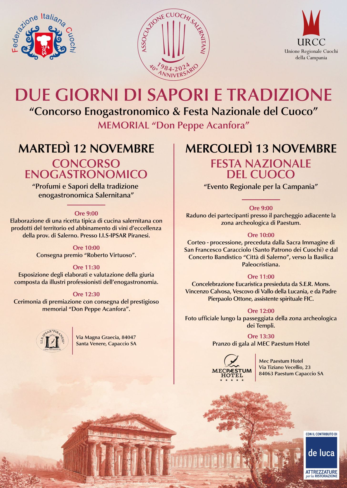 L’Associazione Cuochi Salernitani, aderente alla Federazione Italiana Cuochi e all’Unione Regionale Cuochi della Campania, ha indetto il Concorso Enogastronomico Provinciale “Profumi e sapori della tradizione enogastronomica salernitana”. Il Concorso vuole onorare la memoria di Don Peppe Acanfora, noto imprenditore dell’ospitalità e della ristorazione alberghiera della città dei templi.