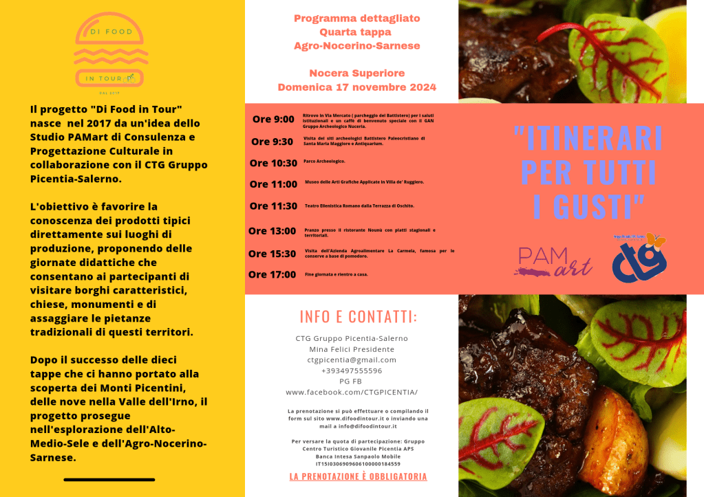 Il CTG Gruppo Picentia di Salerno, presieduto dalla Dott.ssa Mina Felici, invita tutti i cultori dell’archeologia e dell’enogastronomia a partecipare a questa iniziativa, che rappresenta un’occasione unica per esplorare il passato millenario della città e apprezzare le eccellenze culinarie e produttive del territorio. La Dott.ssa Annamaria Parlato, Vice Presidente del CTG Picentia, ha sottolineato: “Negli ultimi anni, l’interesse verso il turismo esperienziale è cresciuto significativamente, e i visitatori cercano sempre di più un contatto autentico con le tradizioni locali. La nostra terra offre esattamente questo: la possibilità di immergersi nella bellezza senza tempo dei suoi monumenti, di scoprire antichi saperi e di assaporare il gusto unico dei nostri prodotti. È un turismo che va oltre il semplice “vedere” e “gustare”: è un turismo che fa vivere il luogo, che crea un legame profondo e duraturo. Iniziative come “Food in Tour” sono fondamentali per raggiungere questi obiettivi, poiché permettono ai visitatori di scoprire luoghi spesso poco conosciuti e di apprezzare le nostre eccellenze culinarie. Tuttavia, sappiamo bene che il lavoro delle associazioni di promozione sociale, è spesso una sfida costante. Le associazioni come la nostra, infatti, operano grazie al prezioso contributo dei volontari e alla passione di chi crede fermamente nel valore del nostro patrimonio. Ma è importante riconoscere che, senza un adeguato supporto e sostegno, queste organizzazioni non potranno a lungo andare portare avanti progetti come “Di Food in Tour” né offrire ai visitatori un’esperienza di qualità, migliorando i servizi. Investire nel turismo enogastronomico significa anche investire nella tutela dei nostri borghi, delle nostre comunità e delle tradizioni che ci rendono unici. È un impegno che richiede collaborazione, visione e sostegno da parte di tutti, dalle istituzioni pubbliche ai partner privati”. Il Food Blog 2Ingredienti Arte&Cibo sarà media partner dell’evento.