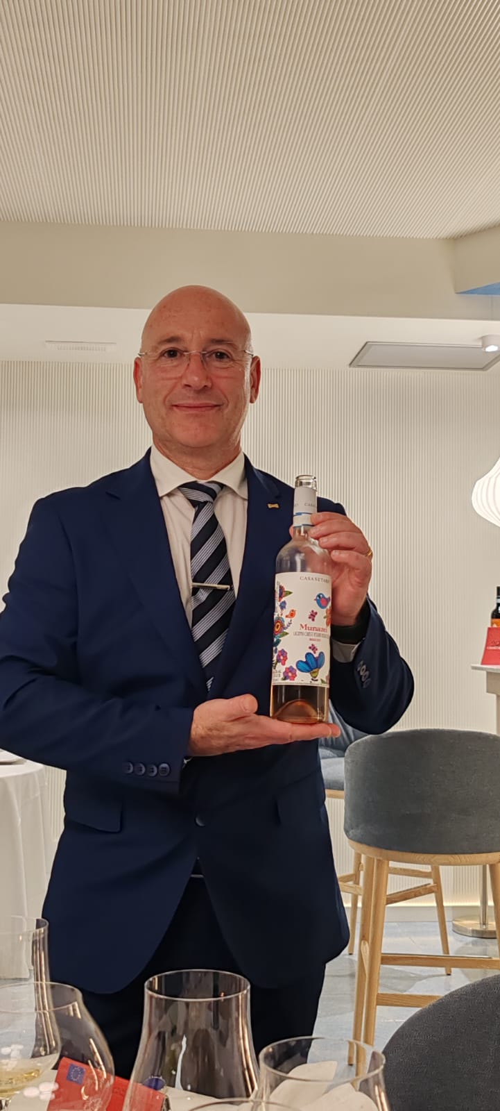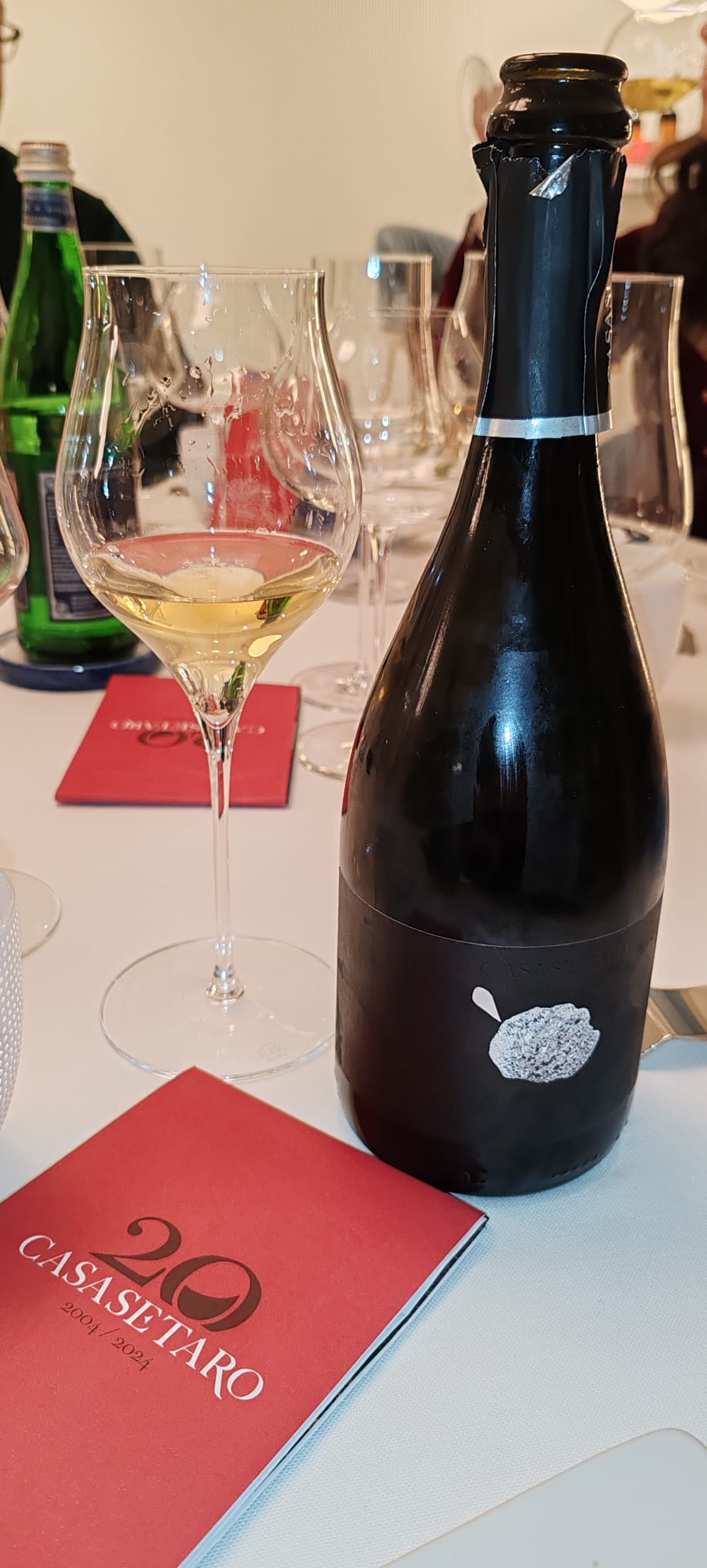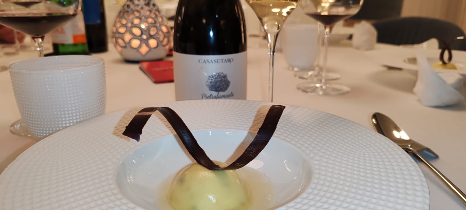 Come predessert, uno yogurt al mandarino acido e spuma di mandorle, che ha rinfrescato il palato con le sue sfumature agrumate e cremose. Per chiudere la serata, la cassatina napoletana con ricotta di pecora, glassata al cioccolato bianco e decorata con nastro di cioccolato fondente su salsa di bucce di arance ottenuta per estrazione dei liquidi e oli essenziali degli agrumi, un dessert raffinato e avvolgente. Entrambi i piatti dolci sono stati abbinati allo spumante “Pietrafumante Brut”, che con la sua vivace effervescenza ha aggiunto leggerezza e freschezza al finale. La versione Brut Nature del Pietrafumante è ancora più intensa e diretta nella sua espressione. Priva di dosaggio zuccherino, esprime al meglio la purezza del Caprettone e del suo terroir. Alla vista si presenta con un colore dorato tenue e un perlage elegante. Al naso offre note di pompelmo, fiori di campo e mandorla fresca. Al palato è asciutto, diretto e molto minerale, con una persistenza che lo rende ideale anche per piatti complessi come crostacei, tartare di pesce o formaggi freschi.