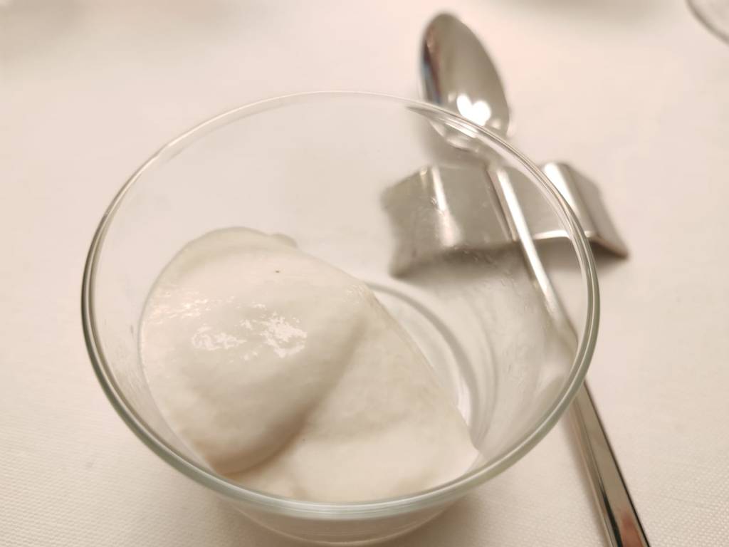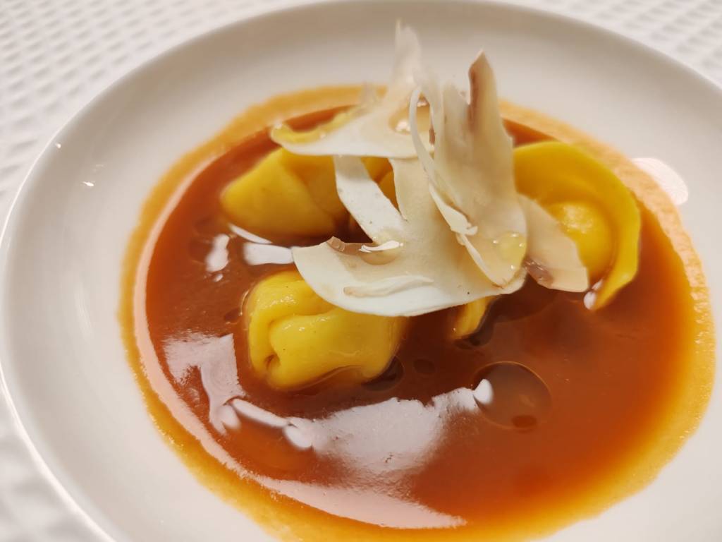 Lo chef poi ha proposto dei tortelli al parmigiano 36 mesi su zuppetta di crostacei e lamelle di champignon, un piatto ricco e saporito, abbinato ancora ad Aryete che con la sua complessità aromatica ha equilibrato la dolcezza dei crostacei. Questo è un caprettone in purezza affinato in anfora, che permette al vino di sviluppare complessità e profondità. Si presenta con un giallo dorato brillante. Al naso emergono profumi di fiori secchi, cedrina e mandorla tostata, aromi affumicati e balsamici accompagnati da una nota minerale tipica del terroir vesuviano. Al palato è pieno, avvolgente e complesso, con una sapidità che esprime appieno la sua origine.