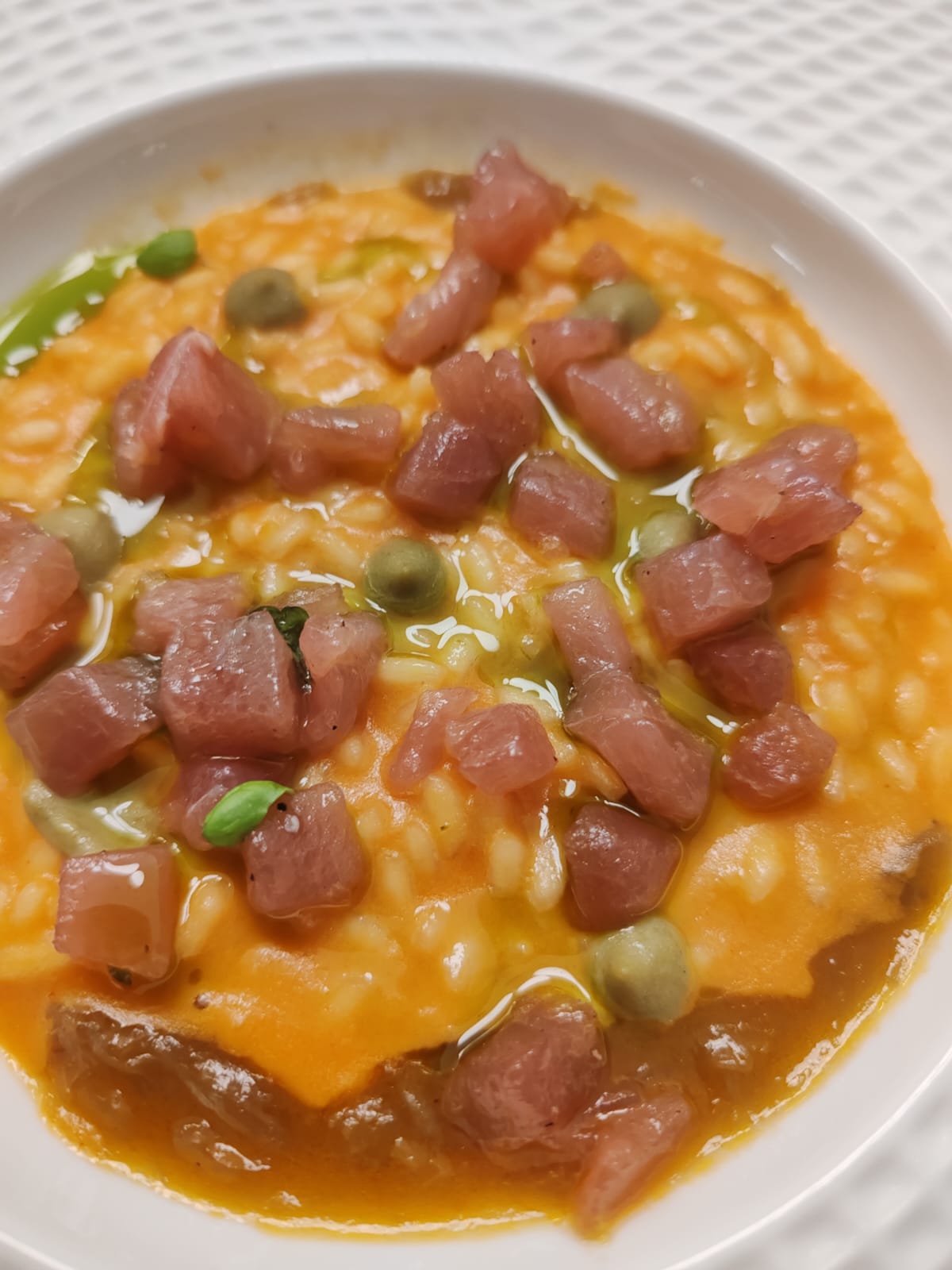 A seguire, un sorprendente risotto all’arrabbiata con fondo di genovese e tartare di tonno piccante, un’esplosione di sapori intensi e decisi in cui sono stati utilizzati pomodori locali come il Fiascone di Tramonti assieme a piennolo e corbarino. Qui è stato servito il “Munazei Rosato”, che con le sue note fresche e leggermente fruttate ha attenuato la piccantezza del piatto e valorizzato la sua profondità. Ottenuto principalmente da uve Piedirosso alla vista, si presenta con un rosa tenue e brillante, al naso regala sentori di piccoli frutti rossi, come fragoline di bosco e ciliegie, con una nota floreale delicata di geranio e rosa. Al palato ha una vivace acidità e un finale piacevolmente minerale.