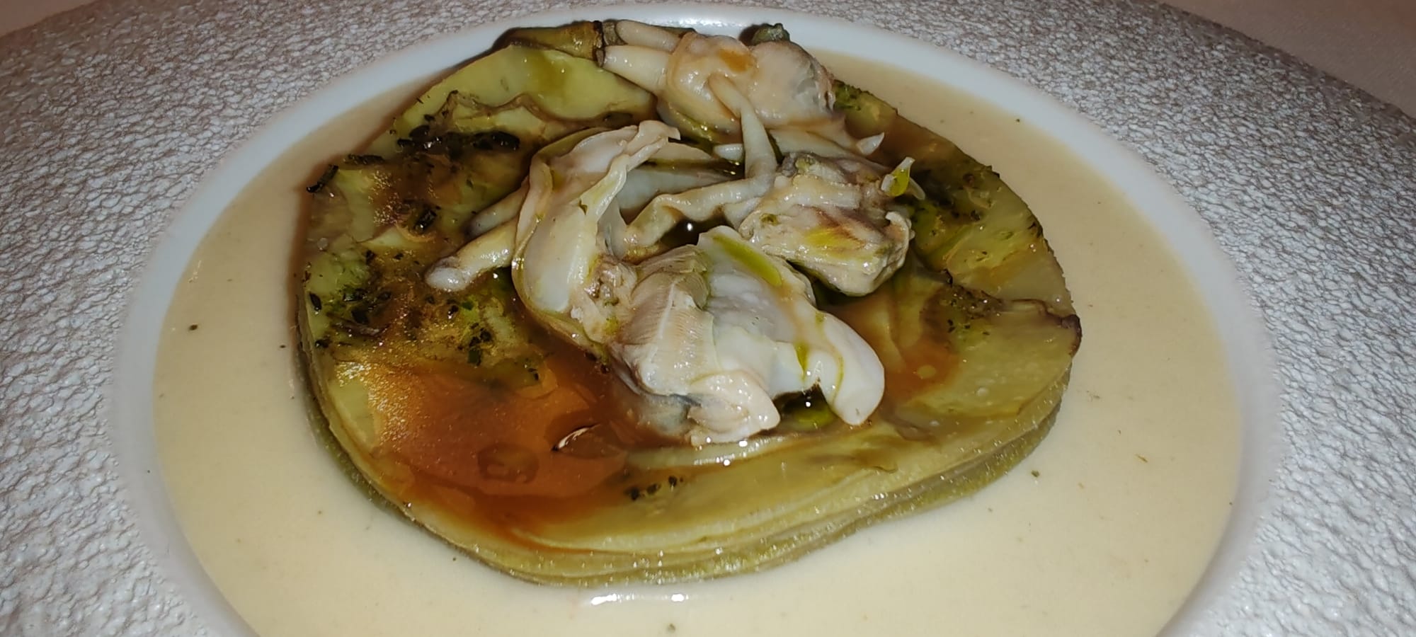 Il secondo antipasto, un carciofo cotto a bassa temperatura su patata fondente e guazzetto di vongole, ha conquistato il palato con la sua armonia di consistenze e il sapore delicato dei frutti di mare. Questo piatto è stato accompagnato da Aryete Bianco, un vino che nasce da Caprettone 100% a piede franco, affinato in anfora, che al naso sprigiona profumi floreali e di frutta secca, con una mineralità che ha reso l’abbinamento straordinario.