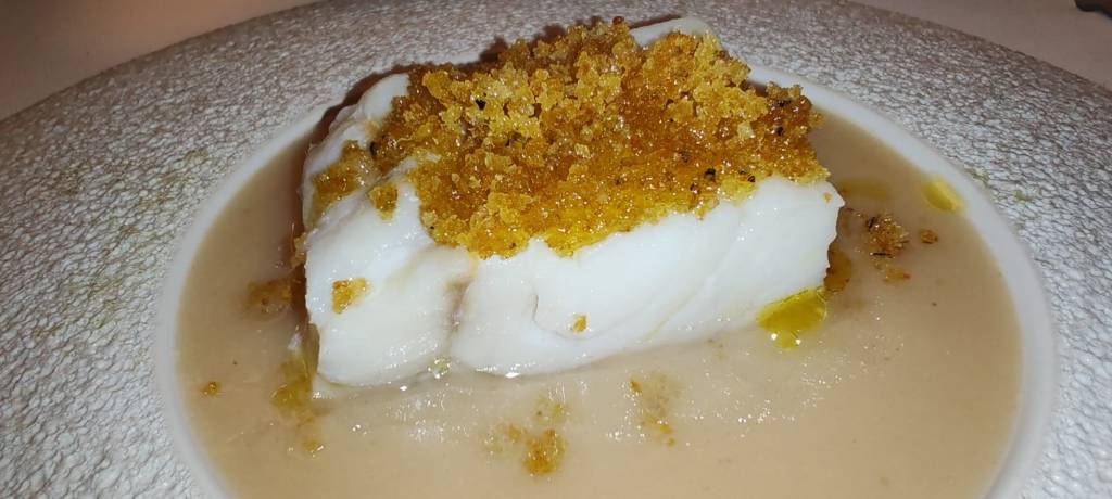 L’atmosfera elegante ed accogliente, ha reso l’evento un’occasione ideale per scambiarsi gli auguri e vivere un’esperienza indimenticabile. La serata, curata dallo chef Alfonso Crisci, è stata un viaggio enogastronomico unico, in cui i suoi piatti si sono armoniosamente intrecciati con i vini della prestigiosa cantina Casa Setaro di Trecase (NA). La serata è iniziata sulla terrazza panoramica di Oltremare, con una vista mozzafiato sul mare al tramonto. Gli ospiti sono stati accolti dal restaurant manager Enzo D’Amato, dal sommelier Gioacchino Cretella e dalla commis di sala Alessandra Gaito con un calice di “Pietrafumante” Caprettone Spumante Metodo Classico, fresco e vivace che ha preparato il palato per le meraviglie culinarie che sarebbero seguite. Questo benvenuto è stato accompagnato da un’elegante selezione di amuse bouche, anzi un trio di delizie: tonno scottato in pane panko con fibre di sedano, cestino al basilico con provolone del monaco DOP e tartare di gamberi, e un bignè con broccoli e acciughe. Questi piccoli capolavori culinari sono stati esaltati dallo spumante, che con il suo perlage fine e il bouquet agrumato con un notevole accenno di crosta di pane dato dalla sosta sui lieviti, al palato vivace e sapido, con una chiusura minerale che richiama i terreni vulcanici, ha esaltato i sapori dei finger degustati in un sol boccone. Il primo antipasto, polpo in salsa verde con aceto di mele e la sua emulsione, ha impressionato per la tenerezza del mollusco e la particolarità della salsa. Anche in questo caso, il “Pietrafumante” si è rivelato un abbinamento ideale, esaltando le note acidule e leggere del piatto, esteticamente perfetto.