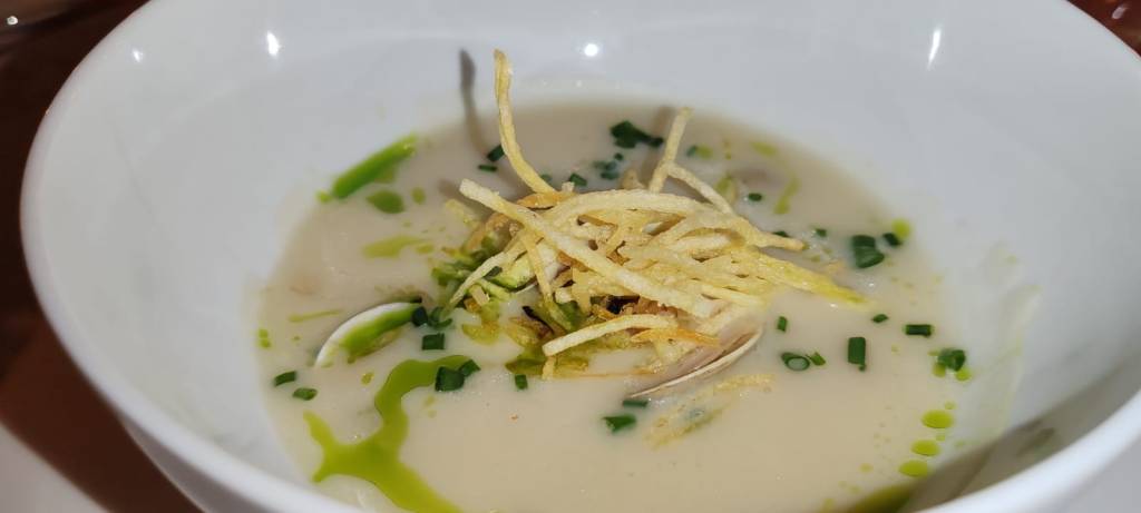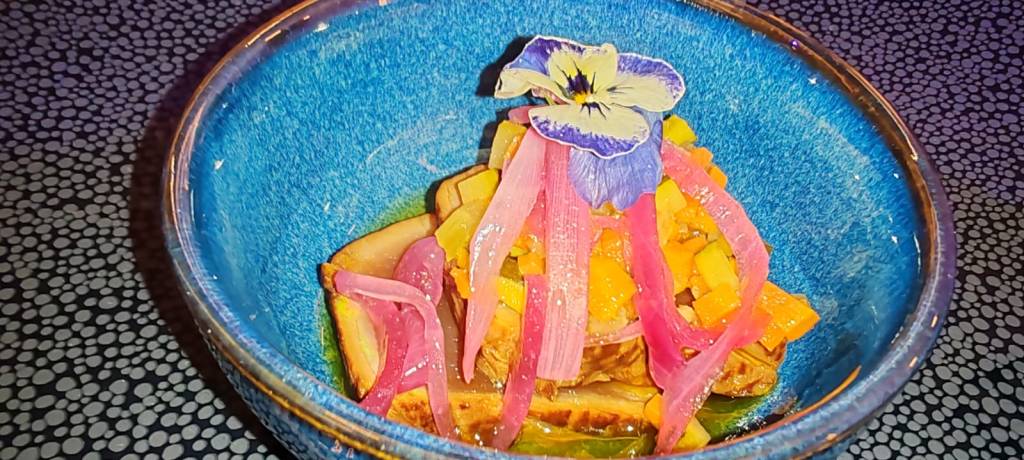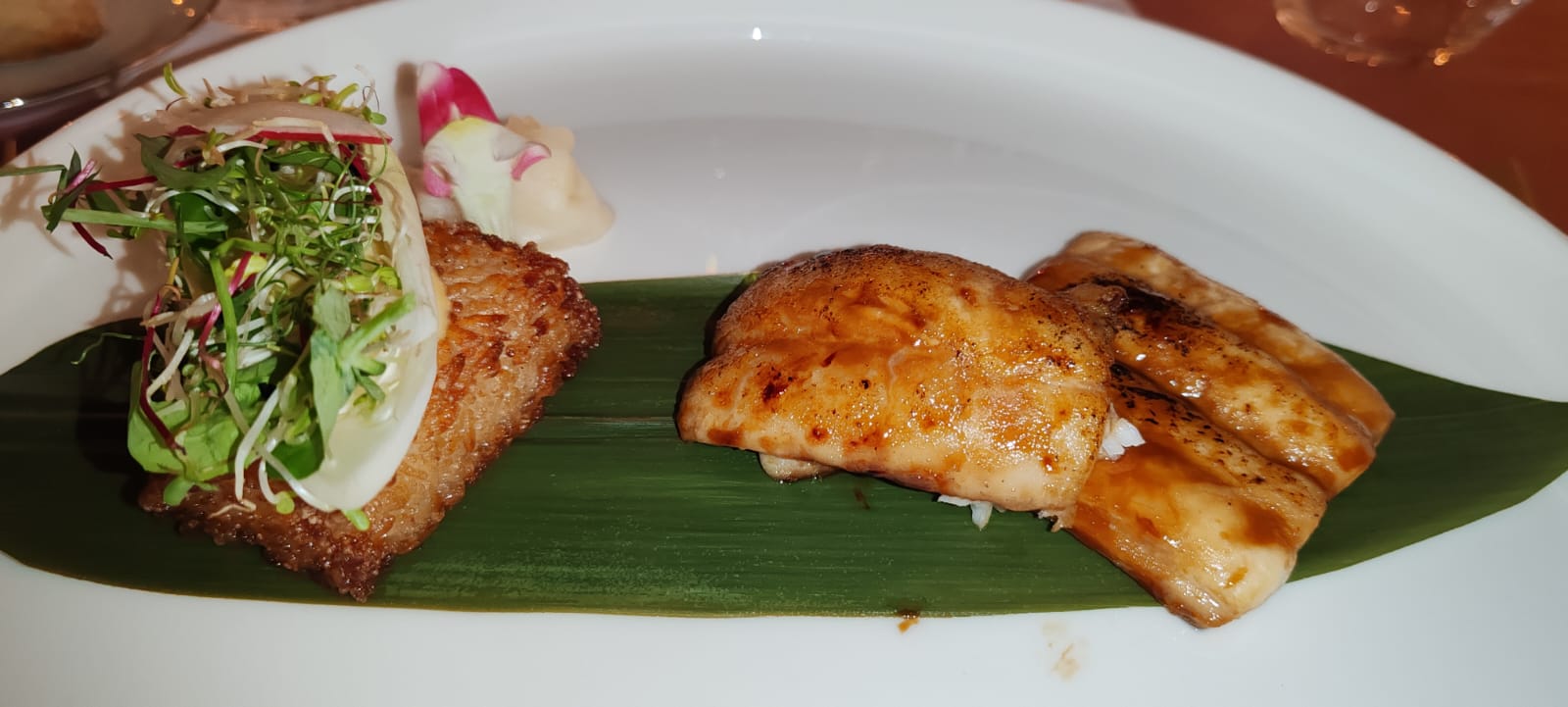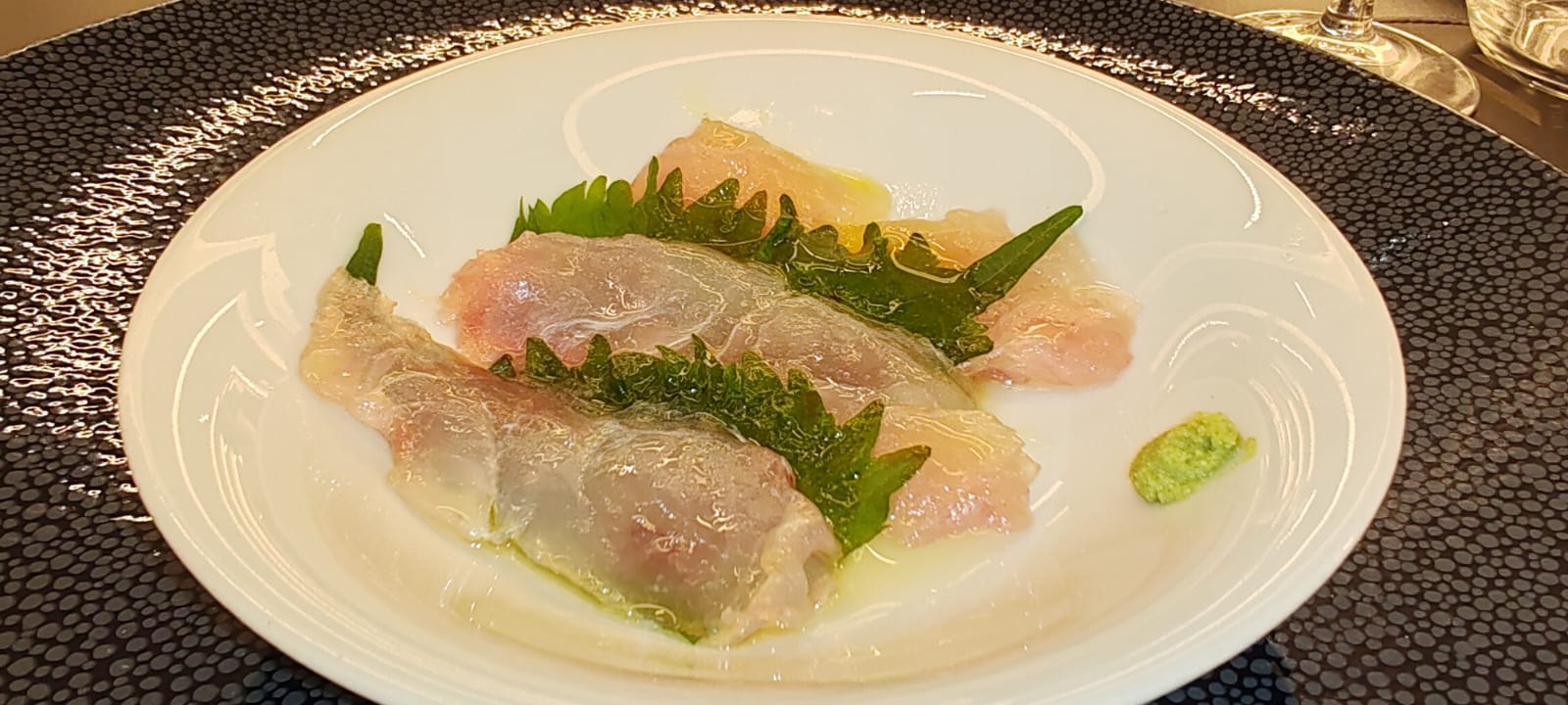 La serata si è aperta nel segno della omotenashi, quell’arte giapponese dell’ospitalità totale che va ben oltre la semplice accoglienza. Già negli amuse-bouche si percepiva il dialogo tra i due mondi: il crudo di dentice al wasabi e foglie di shiso, il panzerotto ripieno di bianchetti al finocchietto selvatico e il bonito marinato alla soia su pinzimonio di verdure hanno danzato con la freschezza vivace dell’Hatsumago Yukikoibana Sparkling, un sakè frizzante, floreale e gentile, che ha introdotto gli ospiti alla leggerezza dell’omotenashi.