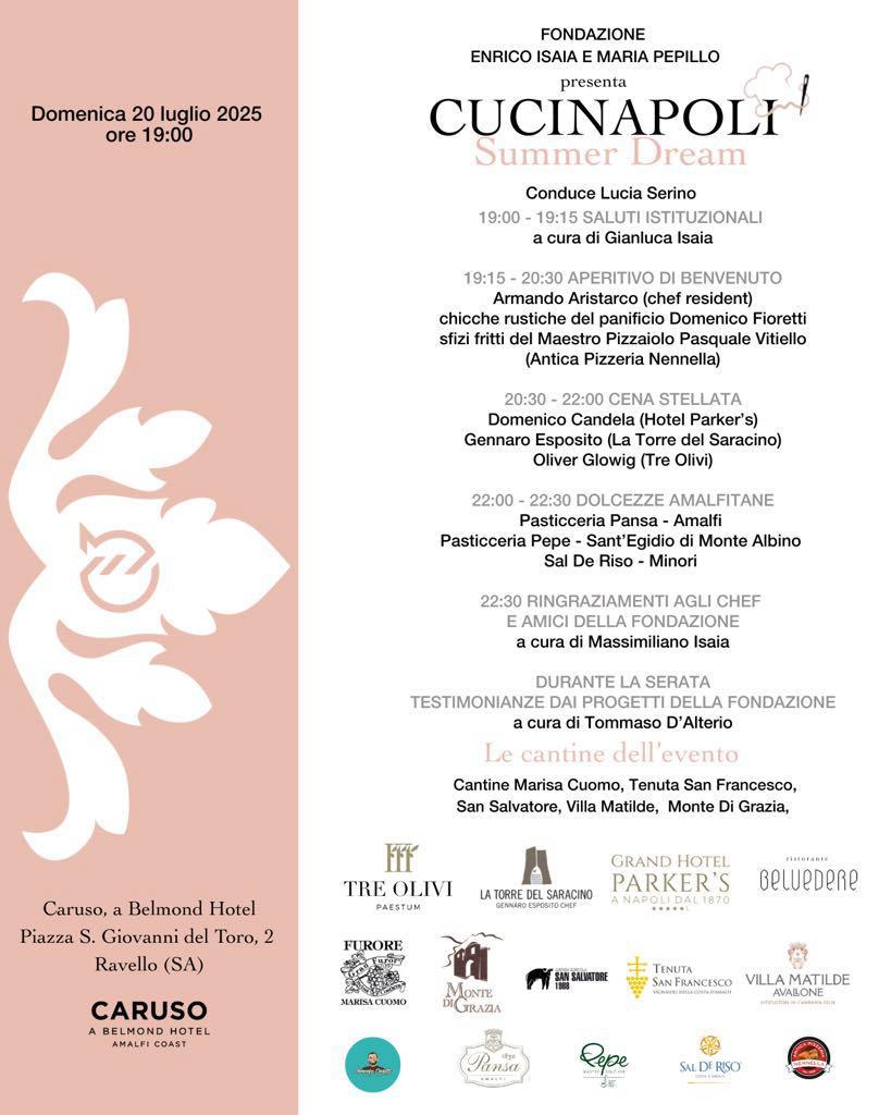 Si parte alle ore 19,00 con i saluti istituzionali della Fondazione Isaia a cura di Gianluca Isaia, Presidente dell’omonima Fondazione, e Iolanda Mansi, General Manager del Caruso, per poi procedere con un vero e proprio show di eccellenze campane che vanno dall’aperitivo d’autore di Armando Aristarco fino agli sfizi fritti del Maestro Pizzaiolo Pasquale Vitiello della Pizzeria Nennella. A seguire l’estro dei tre stellati, i vini che, ancora una volta, faranno da “ cucitura” tra più aree della Campania ed amalgameranno territorio e tradizioni, esperienza e retaggi, da Marisa Cuomo a Monte di Grazia e Tenuta San Francesco, passando per Villa Matilde e San Salvatore. Stesso percorso per i dolci, una vera e propria celebrazione del meglio della pasticceria locale con Pepe, Sal De Riso e Pansa.