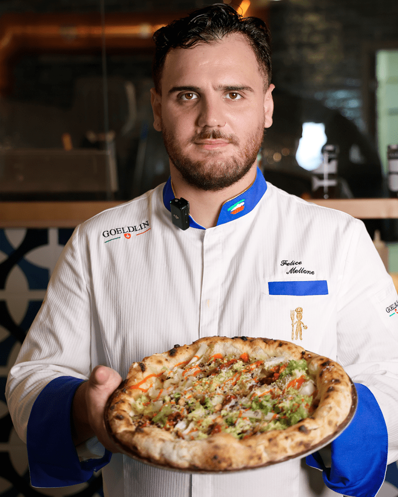 Felice Mellone scopre il mondo della ristorazione a soli diciotto anni, quando un infortunio lo costringe a lasciare la carriera da calciatore e a lavorare prima come cameriere, seguendo le orme del padre come maître di sala. La passione per il banco pizza cresce presto e diventa una vera missione di vita: studia, lavora in diverse pizzerie e sviluppa un’idea chiara di ristorazione, oggi pienamente espressa nel suo locale.