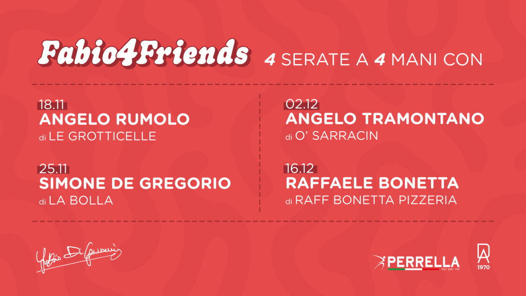 La rassegna Fabio4Friends vuole mettere assieme alcuni dei massimi esponenti del Mondo Pizza per offrire delle esperienze, sapori e filosofie diverse legate alla pizza. Nei 4 appuntamenti previsti, infatti, ci sarà spazio per la pizza a ruota di carro, per la pizza contemporanea, per la pizza dolce, per la selezione della materia prima e per l’innovazione nelle tecniche di impasto. Ogni ospite della cena a 4 mani, infatti, porterà la propria filosofia all’interno della pizzeria di Fabio Di Giovanni, dando vita ad esperienze uniche.