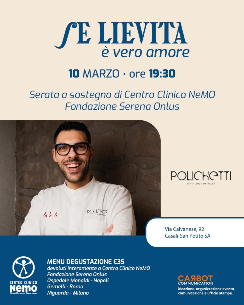 Una serata all’insegna della solidarietà, del gusto e dei valori autentici è il focus di “Se lievita è vero amore”, l’evento benefico che coinvolge il mondo della pizza in iniziative concrete a sostegno della Fondazione Serena Onlus per il Centro Clinico NeMO presso l’Azienda Ospedaliera Specialistica dei Colli – Ospedale Monaldi Napoli, il Policlinico Gemelli di Roma e l’Ospedale Niguarda di Milano. Martedì 10 marzo alle ore 19.30 tappa del progetto da La Pizza di Polichetti del pizza chef Antonio Polichetti che ha scelto di sostenere il progetto. Un appuntamento speciale pensato per unire la passione per la pizza artigianale alla volontà concreta di fare del bene, l’iniziativa nasce con l’obiettivo di sostenere una causa solidale, dimostrando che quando l’amore è autentico proprio come un impasto che lievita con cura e pazienza che può generare qualcosa di straordinario.